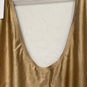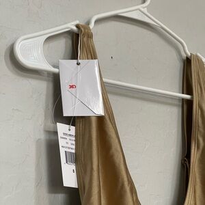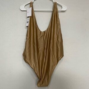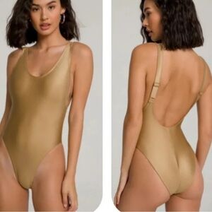 Good American HIGH CUT DEEP BACK ONE PEICE size 8. New with tags. Cheeky high leg one piece. Top stitching on neck and armholes. High cut at the hips. Adjustable straps at back. High shine fabric. Gold bronze metallic color.