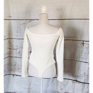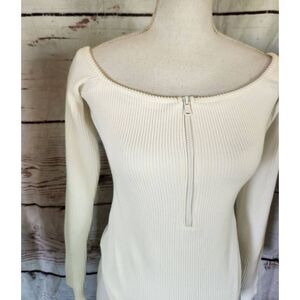 Ribbed ivory long sleeve bodysuit with half zip front. Zip cuffs, partially lined with snap fastenings at base.