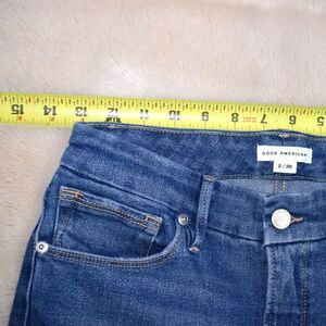 Flattering Good American high-rise cropped straight leg jeans in a classic medium wash — the perfect modern denim fit. Features ankle length with raw frayed hems for that on-trend, lived-in look.