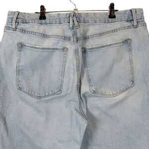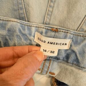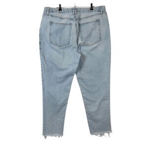 Good American Jeans The Weekender Boyfriend Raw Hem Light wash Size 14. Excellent condition. One light spot on the front which is part of the wash as shown in photo. See photos for details and unstretched measurements. View my closet to add other items and bundle to save with one shipping fee!