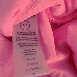 Great dress for getting all the attention! It is a light pink, almost bubblegum. It has a scope neckline, sleeveless and is very form fitting. Stretchy fabric to move when you do. The outside of the dress is bumpy whereas the inside is lined.