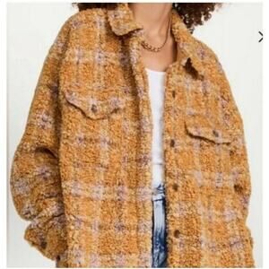 NWT! This Good American shacket in Emory is perfect for any occasion. The oversized, relaxed fit with a long plaid pattern is both stylish and comfortable. A cozy cold-weather option with striking style, this long Good American jacket is crafted entirely from texture-rich sherpa, and is accented with pastel-tinged plaid patterning. The shacket is made of cozy sherpa fabric with a polyester lining material.