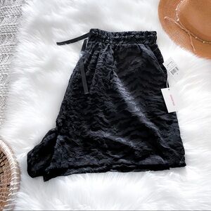 Black animal zebra print, elastic waistband white drawstrings, lightweight and comfortable, side pockets, short fit, high rise, high waist waisted, sheer