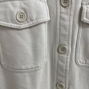 • Features: Bone / off white color, 100% Cotton, Fleece interior, Button up front, Long sleeves with buttons at cuffs, Double front breast pockets with button flap closure, Collared, Shirt jacket / shacket by Good American