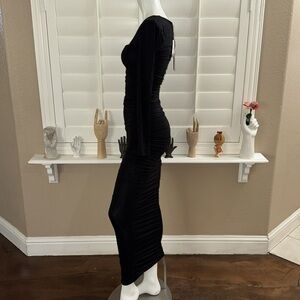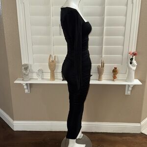Good American RUCHED SQUARE NECK LONG SLEEVE BODY-CON DRESS BLACK
