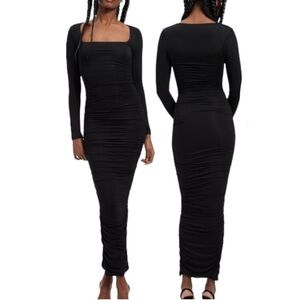Good American RUCHED SQUARE NECK LONG SLEEVE BODY CON DRESS IN BLACK
