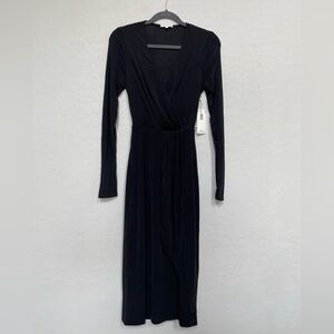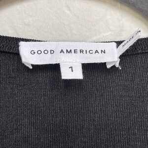 Good American SHIMMER WRAP DRESS size 1 small. New with tag black color. Brand New with tags - A shimmering knit midi sets off every curve in a fitted, faux-wrap silhouette detailed with gathered pleats and a skirt-draping front sash. - Super Stretch - Surplice V-Neck - Long Sleeves - Elastic Waist - Lined, except sleeves and back - 93% Polyester - 7% Elastane