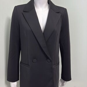 Lined black double breasted blazer with single back slit (still sewn shut)