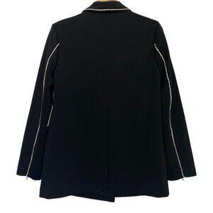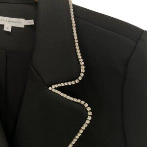 Good American Scuba Crystal Blazer constructed from a heavyweight Neoprene fabric. Beautiful blazer features notched lapels, padded shoulders, long sleeves with zip cuffs, front welt pockets and a back vent. Double-breasted silhouette with button closure and crystal trim. New with tags. Please see pictures for more details and measurements. Good American size 2 = normal size Medium.