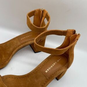 Good American Shoes Sz 5 Tan Suede Ankle Strap Heeled Sandals Block Heel Dressy