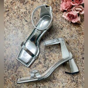 Good American Silver Block Heel Square Toe Sandals in Silver 7.5