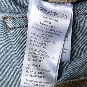 Good American blue jeans size 15 — 34x25 cropped mini boot style with a 34” waist, flattering high 12” rise and a 25” inseam. Soft stretch denim blend (72% cotton, 20% recycled cotton, 6% polyester, 2% elastane) in a classic indigo wash with gentle fading. In good condition with no flaws noted. From a non-smoking, pet-free household.