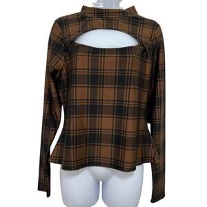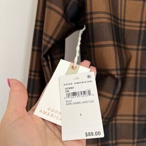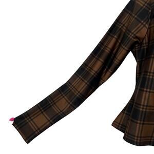 Good American Womens Size 5 Peplum Front Cut Out Top Tan Brown Plaid Stretch NWT MSRP $89