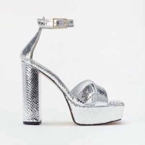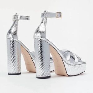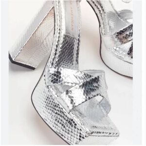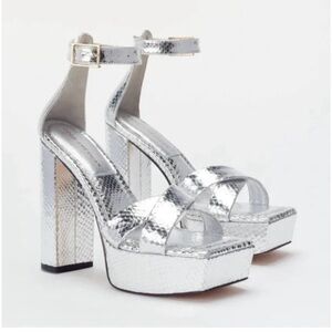 Good American Size: 9 Platform Block Heel Sandals Silver Snake