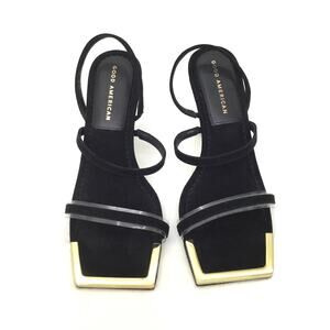 Good American Suede Strappy Heels Gold Square Toe Black Sz 6.5