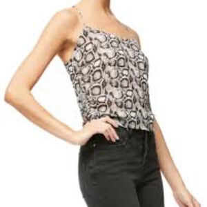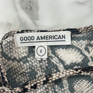Good American Tank Top Womens 2 Black Cream Snakeskin Print Ruched. Adjustable spaghetti straps. Ruched sides. Cropped fit. 100% polyester. Pre-owned Condition- no flaws, no rips, stains, or holes.