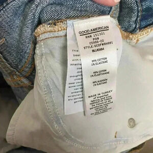 Features: These Good American shorts bring a modern look to classic cutoffs with a fold-over waistband. Tucked-in tees and bodysuits are a great pick for showing off this pair. Heavyweight, low-stretch denim. Fold-over waistband. Fading and whiskering. Frayed hem. Button fly. 5-pocket styling