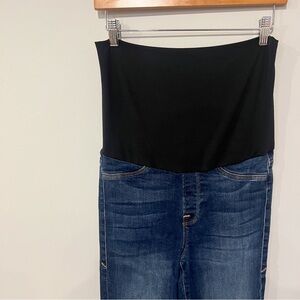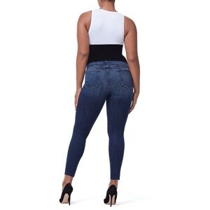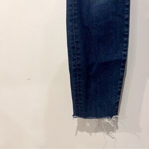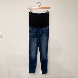 Sleek and stretchy skinny jeans. Dark blue hue. Ideal for maternity comfort. Raw frayed hem. Women’s size 4 / 27.