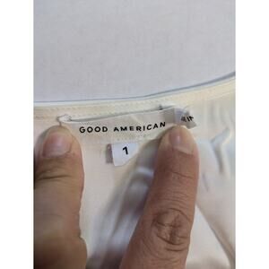 Elevate your wardrobe with the versatile Good American top in a crisp ivory white. Designed for the modern woman, this size small blouse boasts a flattering V-neck and trendy balloon sleeves, making it an ideal choice for a range of occasions from business to casual, and even for formal events.