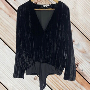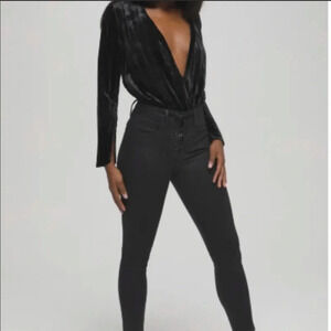 Good American brand Velvet Plunge Wrap Bodysuit One Piece Outfit, size 3. Good American size chart indicates size 3 is equivalent to a US large L. Brand new with store tags NWT Solid black crinkle velvet style fabric, snaps at crotch. Long sleeves, open near wrist area. Plunge V neck style faux wrap design. Smoke free, pet free home