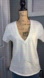 This crisp white t-shirt from Good American features a flattering deep V-neckline and a fitted silhouette, perfect for a sleek and stylish look. Made from lightweight material, it offers comfort and a casual, relaxed appearance. The short sleeves and bright white color make it a versatile addition to any wardrobe. There is a slight stain on the left side V (shown in picture contrasted against a towel).