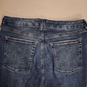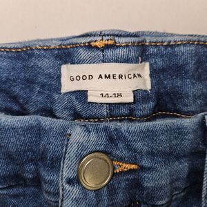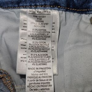 Pre-owned Good American women's size 14-18 high rise gap proof waistband in stretch denim. Cropped straight leg with 5 pocket styling and all day support. Body slimming. Button and zip fly closure. Cotton/Poly/Elastane Blend. Minor fray at bottom of leg...see photo.