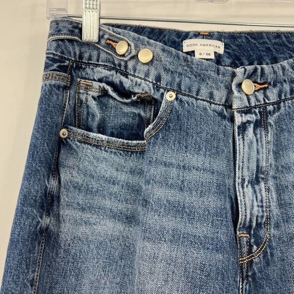 Elevate your wardrobe with these Good American high-rise straight leg jeans. The medium wash denim with distressed accents give a trendy 90s vibe, while the solid pattern and button and zip closure keep them classic. The 100% cotton material and machine washable garment care make them easy to wear and care for. These jeans feature pockets and have a waist size of 28 inches, perfect for a relaxed fit. These Good American jeans are a regular fit.. They are perfect for any occasion and can be dressed up or down. The brand is known for its quality and these jeans are no exception. Made in China, these jeans are not handmade but are still crafted with care. Add them to your collection and enjoy the comfort and style they provide.