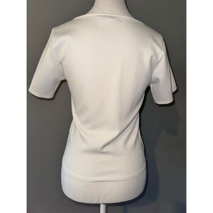 Keywords: Good American, women's T-shirt, white, scoop neck, short sleeve, casual wear, spring fashion, nylon, elastane, scuba fabric, machine washable, size 2, pre-owned, solid pattern.