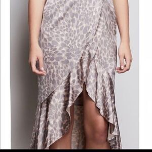 Halter neckline - sleeveless - ruffled hem - high low hem - midi length - center cutout - open back - allover leopard print.