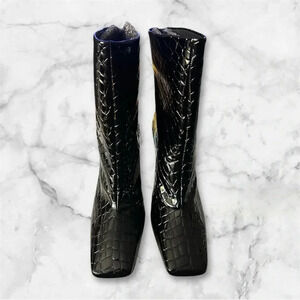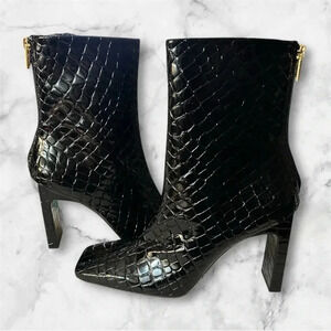 Framed by a contemporary square toe and block heel, this croc embossed bootie will elevate your look with modern sophistication and flawless style