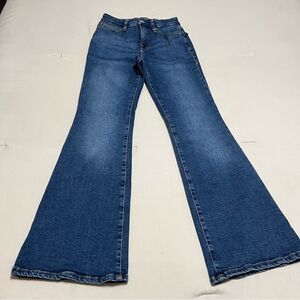 These Good American jeans feature a stylish flare and wide leg design in a classic blue hue. The medium-to-dark wash with subtle fading adds a touch of casual elegance, making them perfect for any occasion. Crafted with quality denim, they offer a comfortable fit and a timeless silhouette.