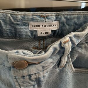 Good American Light Wash Stretch High Waisted Boyfriend Straight Leg Cropped Jeans Size 26. In excellent condition and so comfy. Perfect for summer!
