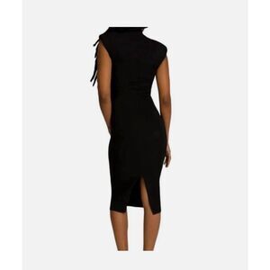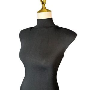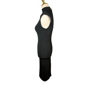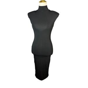This is a new, black, sleeveless midi dress with a mock neck. It is made of a stretchy, soft fabric and has a fitted silhouette. The dress has a small slit in the back and is approximately 40 inches long. It is in new condition with tags and comes in a box.