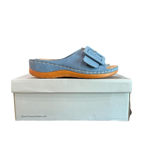 Chic blue mules with a stylish buckle. Comfortable tan sole. Perfect for casual wear. You can adjust the width at the buckle. Cushioned footbed.