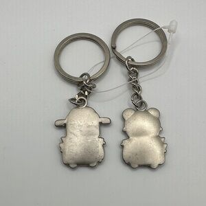 These are a pair of Chinese fortune keychains featuring figures holding signs with symbols of wealth and prosperity. The text on the keychains relates to attracting good luck and fortune in Feng Shui traditions.
