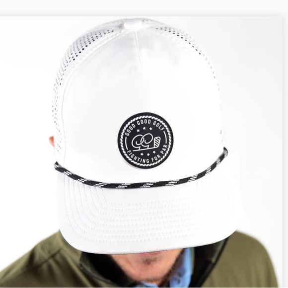 This stylish snapback hat features a white front with a black circular patch, complemented by black piping along the brim. The ventilated mesh back ensures breathability, while the adjustable snap closure offers a customizable fit.