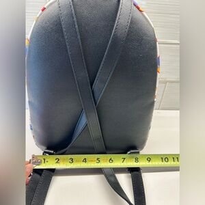 Vibrant backpack with playful graphics. Features a front zip pocket. Perfect for casual outings.