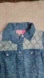 Stylish chambray blue shirt with floral lace accents. Features button-up front and collar.