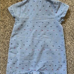 Adorable blue bodysuit with tractor design. Button-up front. Perfect for playful days.