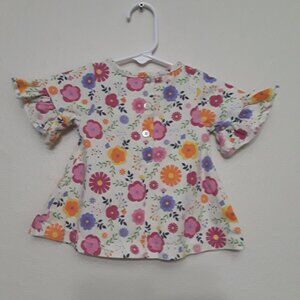Charming floral top with lace detail. Short sleeves. Perfect for any occasion.