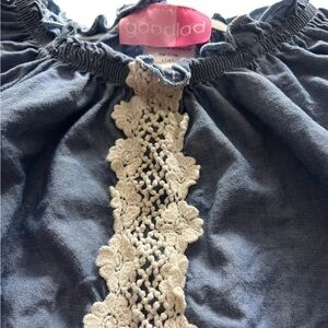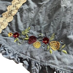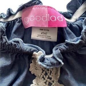 Good Lad Girls Long Sleeve Embroidered Denim Style Dress. Size 4T. Ruffled design at neck, cuffs, and bottom hem. Floral and lace embroidered design. Lightweight fabric. 100% cotton. Machine washable. Good used condition.