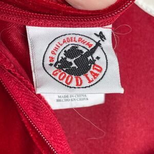 Classic Good Lad of Philadelphia girls’ holiday dress in rich red velvet with white satin accents. Features a sweet Peter Pan collar, gathered skirt, long sleeves with ruffled cuffs, and a satin ribbon waist with a decorative flower. Fully lined with soft red fabric for comfort.