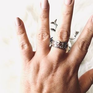 XL unisex band likely to bring luck. Size tag was removed but it runs like a 9-10, rhodium setting so it will not tarnish if properly cared for.