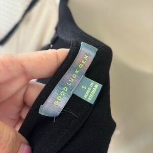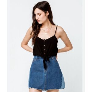 Good Luck Gem Tie Front crop tank top. Lightweight woven tank top features an adjustable button and tie front. Crop hemline. Adjustable shoulder straps.
