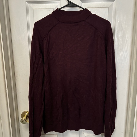 100% merino wool Sweater with mild turtleneck (doesn’t go too high on neck). Deep burgundy color very soft and gently used. Best offer