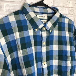 This men’s Goodthreads shirt is a timeless piece, featuring a classic blue and white plaid pattern. Designed with a slim fit, it offers a modern silhouette while maintaining comfort. The shirt includes a button-down front, long sleeves, and a practical front pocket for added style and functionality. Made from 100% cotton, it is soft, breathable, and durable. Brand new with tags, this XXL shirt is a versatile wardrobe staple for both casual and smart-casual occasions.