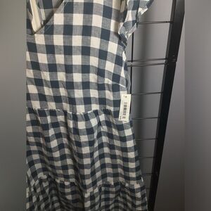 Good Threads peasant dress. Has a navy blue and white gingham pattern throughout. Has a v-neckline and flutter sleeves. Tiered skirt. Measures about 17” p2p. New with tags.