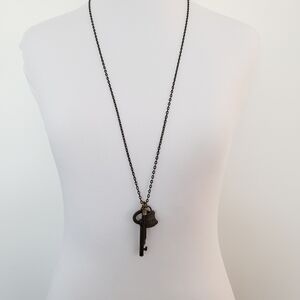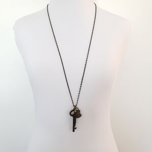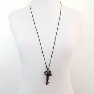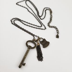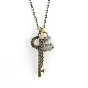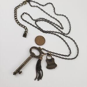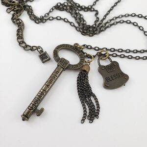 Good Works necklace antique brass - key + tassel + lock pendants layer necklace. Long necklace. Chain is 36 inches in length, including 3 inch chain extender. "good works make a difference" "blessed" "highly favored" "the Lord is with you" Luke 1:28. Good condition. All photos 📷 were taken by me and are of the actual item.