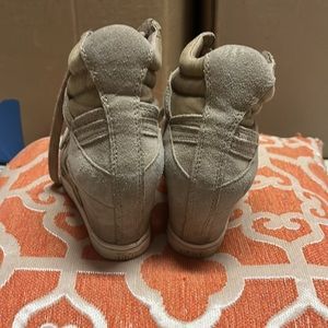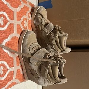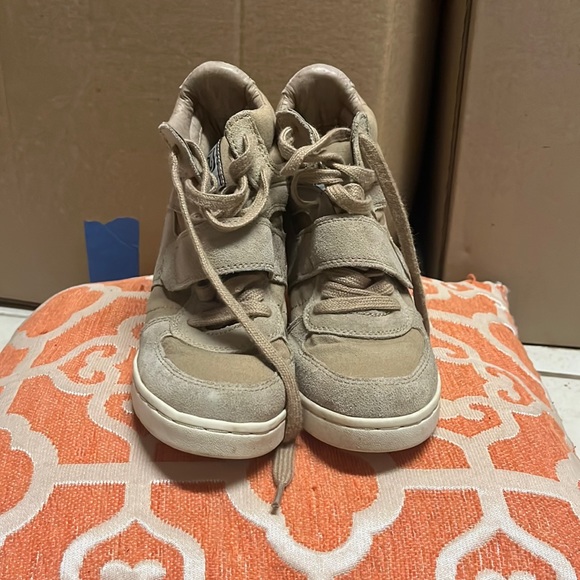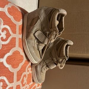 It’s a tan color with a heel and Velcro and lace front
