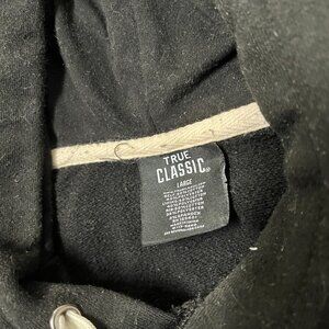 Black hoodie pullover from True Classic. Size large, fleece-lined, in good used condition. Appears to be slightly faded but hardly noticeable on the quality materials. This is the pullover and not the zip or pullover crew-neck sweatshirt.